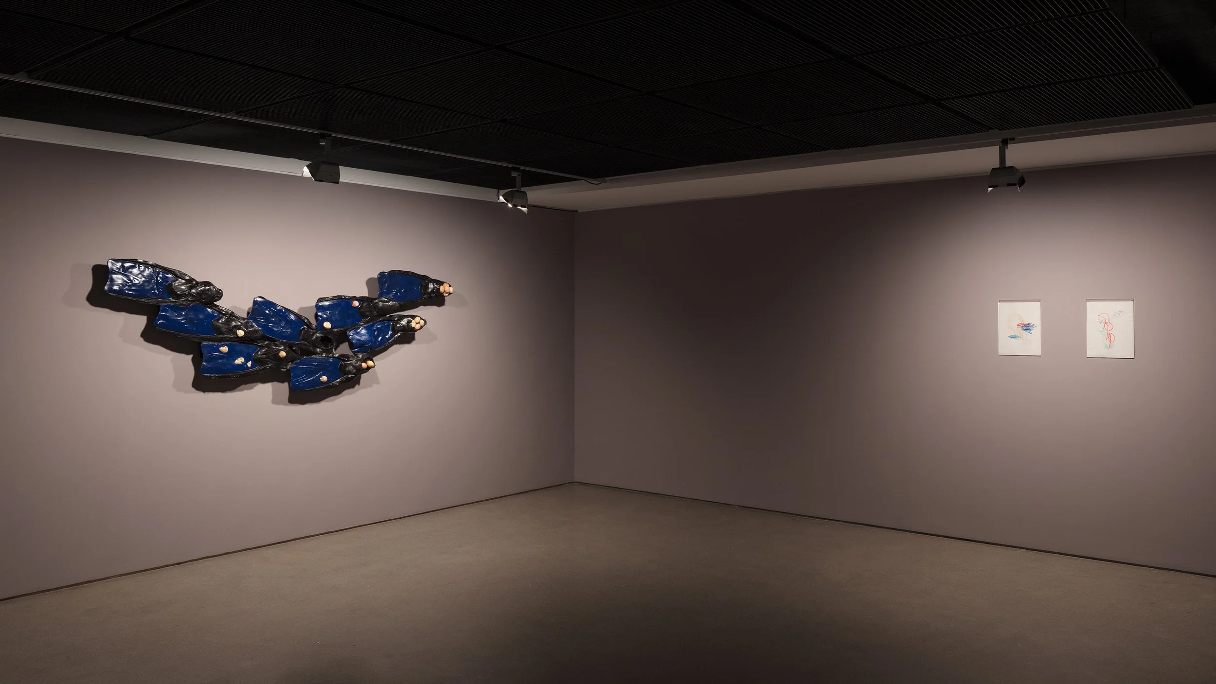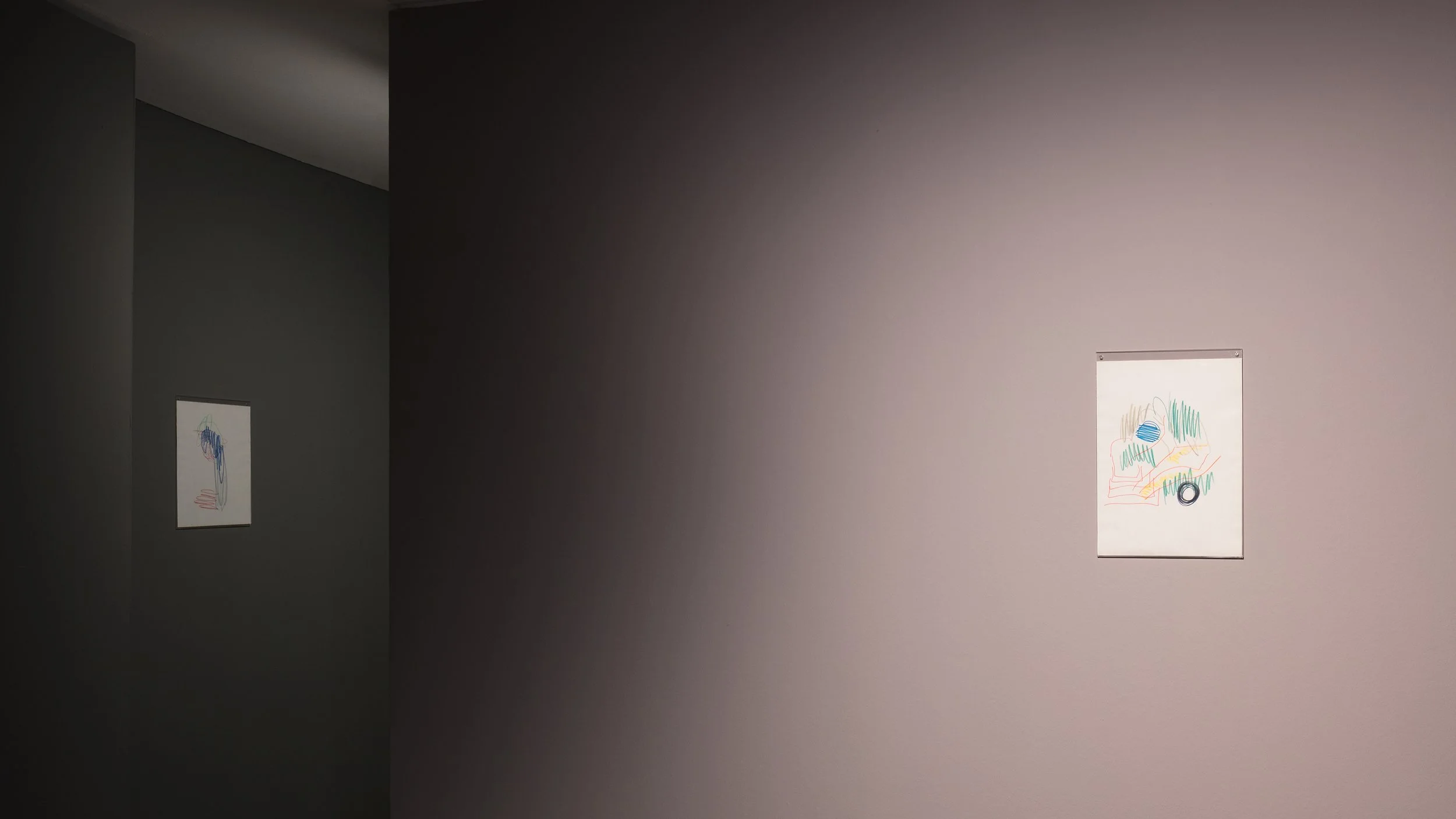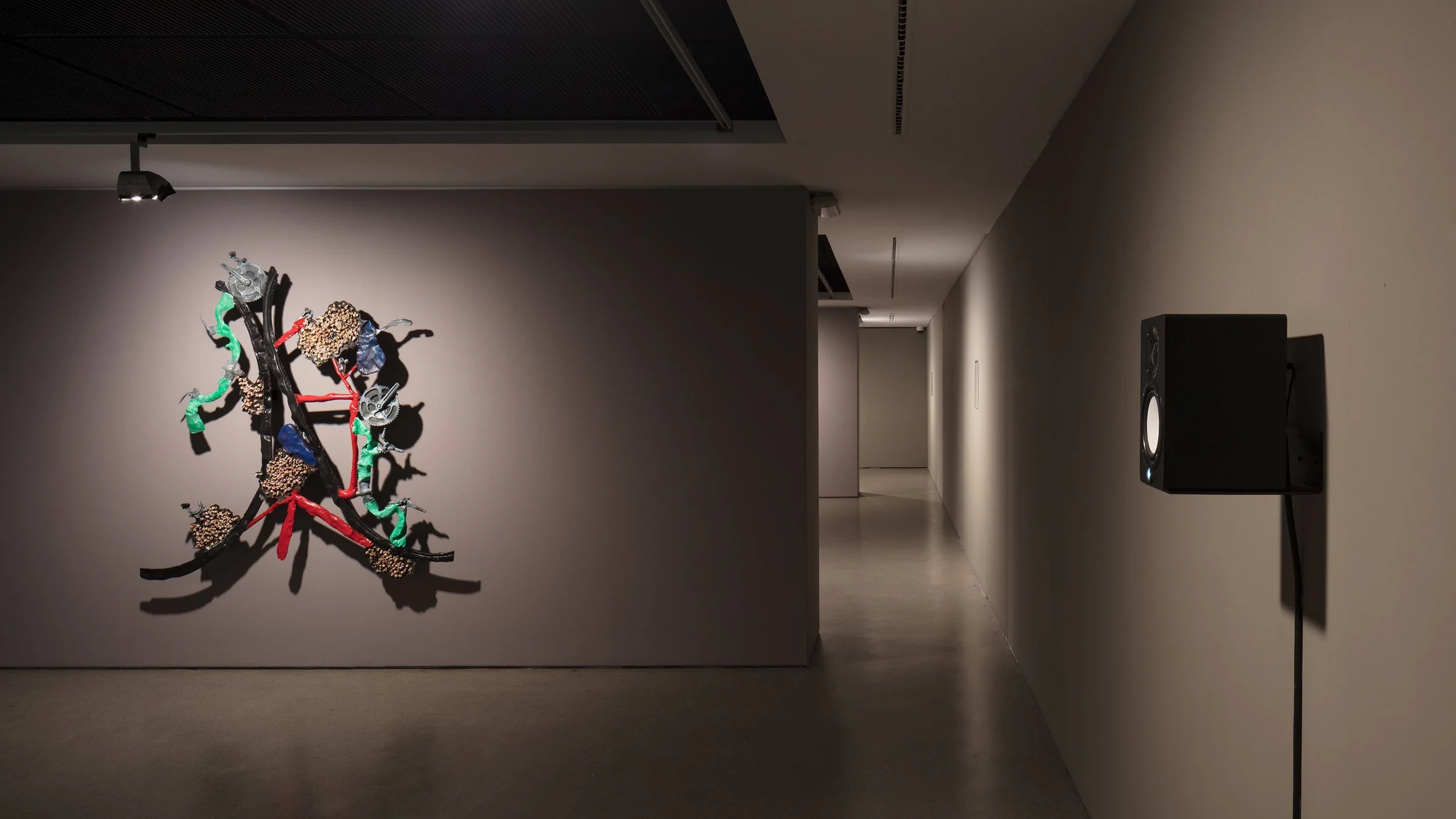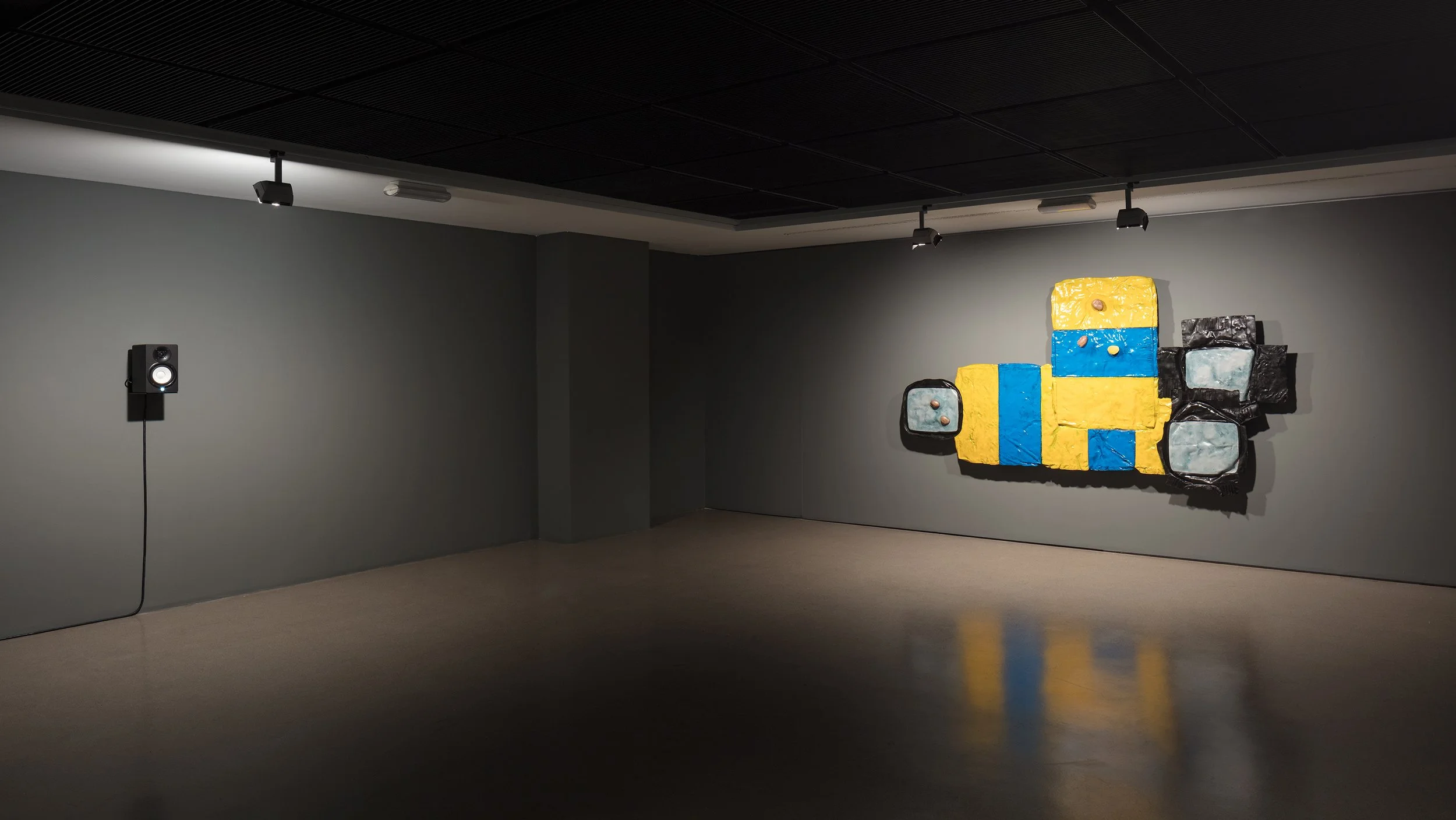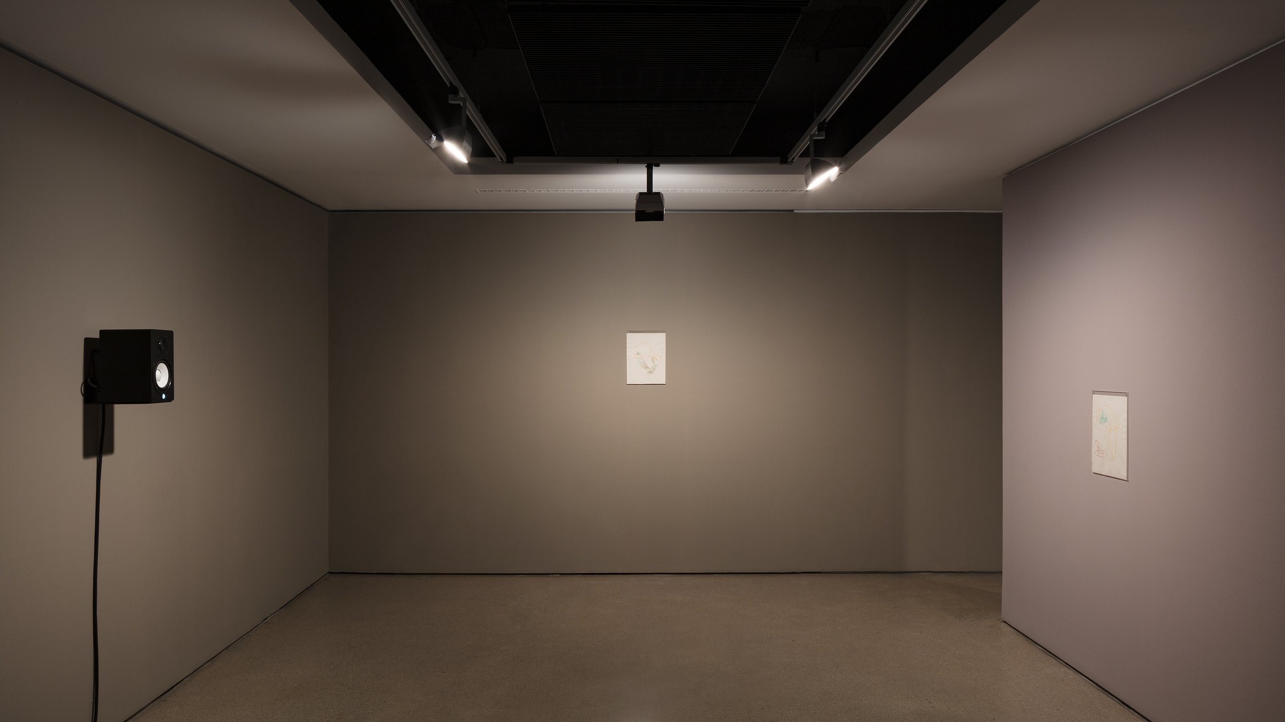 Through a synchronisation system comprising automatic drawing, composite hyper-textured surface sculptures, sound recordings of an interpretative and onomatopoeic voice and timecode-based controlled lighting, a choreography of wandering ontologies permanently shifts from object to subject and vice-versa.